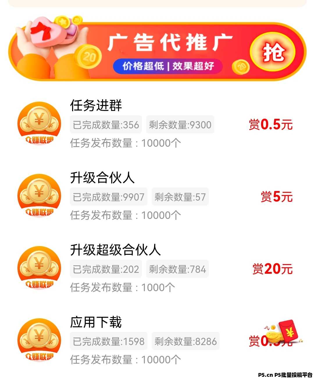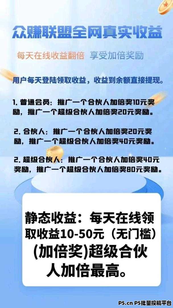众赚联盟是一款与各平台合作的赚钱app,每天登录在线可赚钱,合伙人加倍奖励。