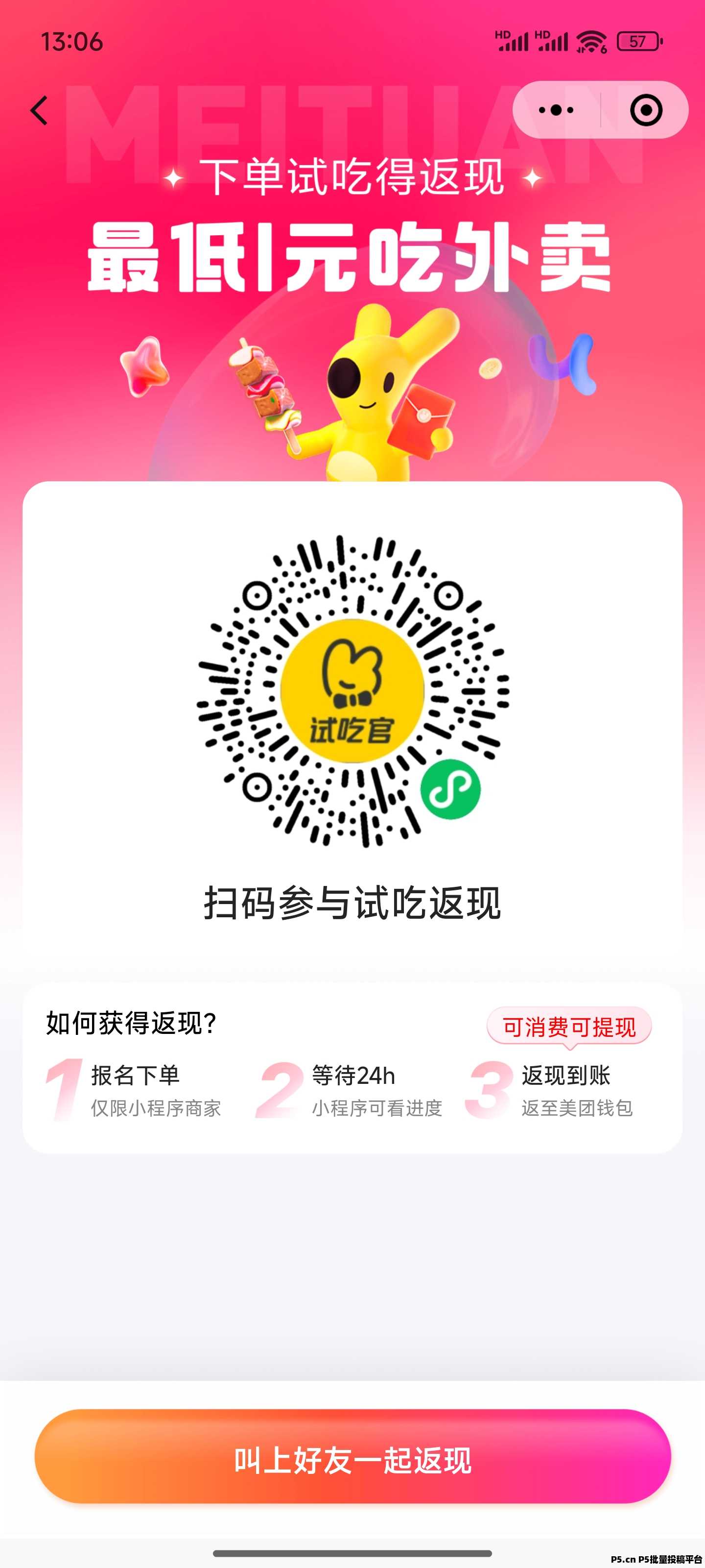 美团试吃官,喜欢点外卖的朋友福音来了点外卖还给返现不用下载扫码小程序