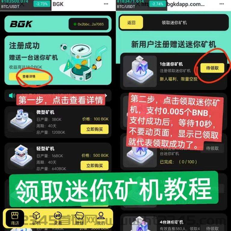 注册赠送一台迷你矿机,为防止机刷,领取时需要支付0.005BNB,迷你矿机可挖出18枚BGK,价值不菲。