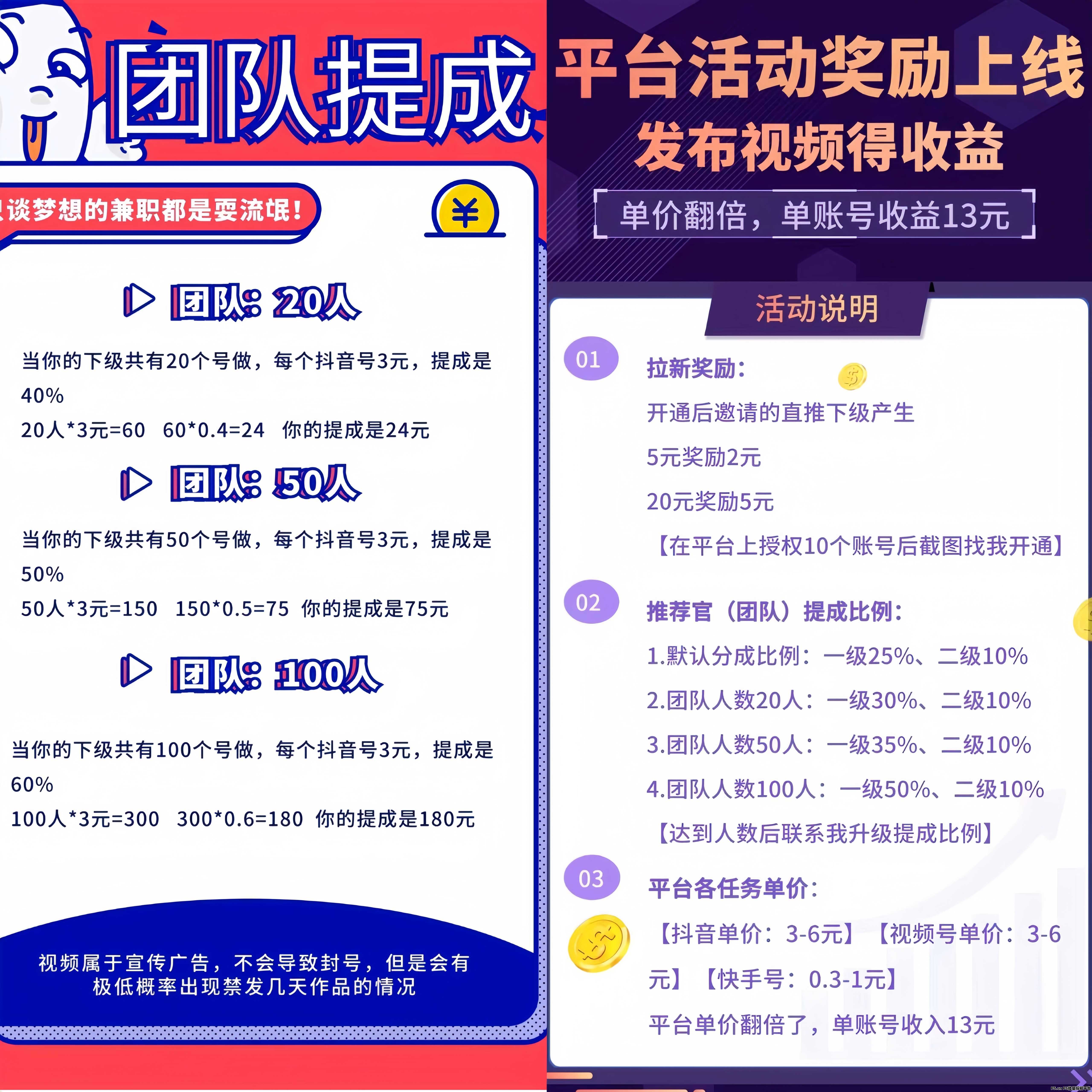 发布视频赚收益,全天随时做任务,一个任务几分钟完成,不看播放量、不看粉丝量、不看实名,只要按要求发了就有收益的,让你的闲置小号轻松给您赚钱!