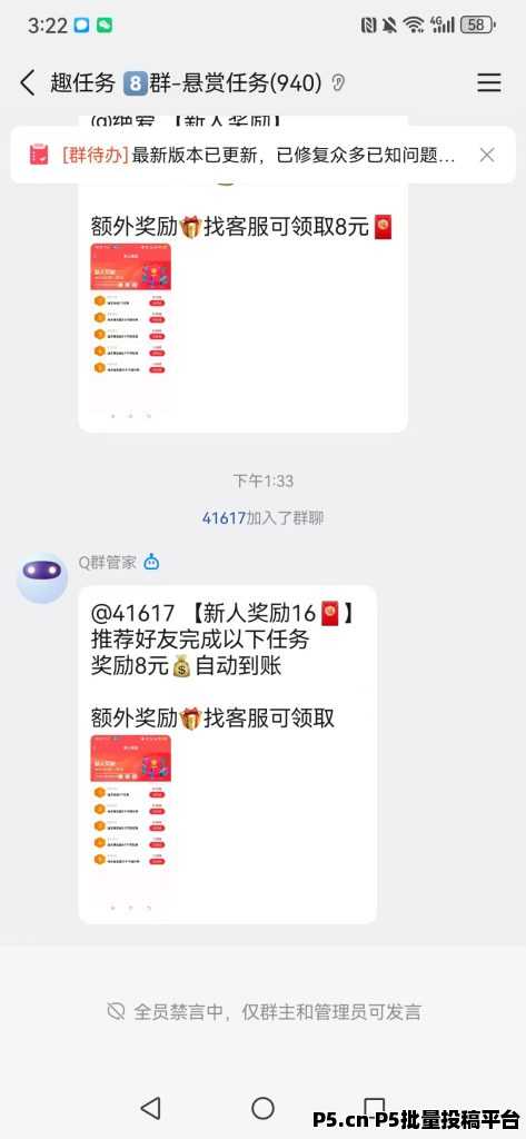 趣任务,提现秒到 机你太美0002612 2025-12-15 21:57:09 735 【趣任务】新出悬赏任务平台,自己做任务得佣金,上线绑定微信微信就送0.3-9.9红包,满1米起提。邀请下级完成12个悬赏任务,下级额外得4米,上级得16米。新一轮的拉新活动于12.15日开启,期待各位团队长,散户参与。官方客服Q群:1057333010