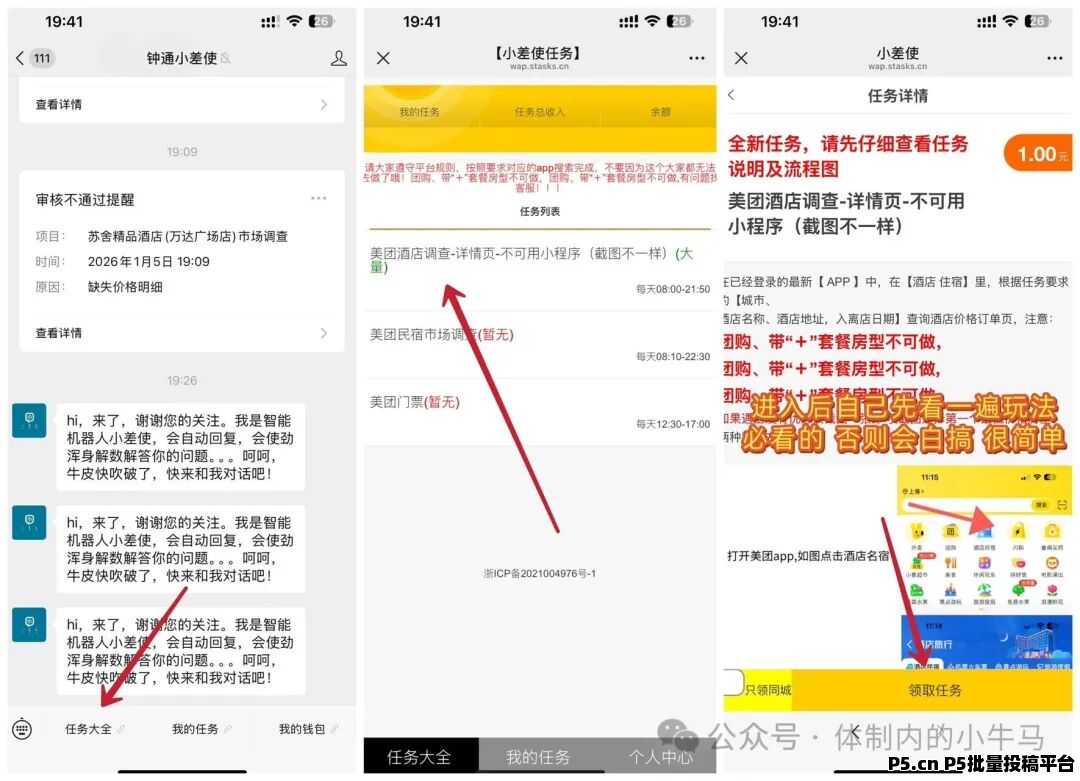 小差使:截图酒店单,操作简单 yimeng000148 2026-01-09 09:05:19 1130 小差使是一个做美团酒店截图单的一个平台,一单1块钱,每天可以无限做,如果你号多一天几十上百不是问题,主要是提现还秒到!操作流程:1、保存图片微信扫码进入2、进入活动后点击下方任务大全---第一个酒店调查任务----领取任务。建议最好是一遍平台玩法,或者在文章末尾看完我发的视频教程,不然怕踩坑,玩法很简单耐心话两三分钟看一下就行。