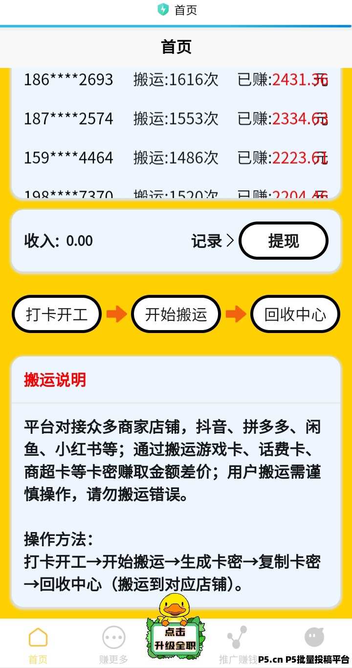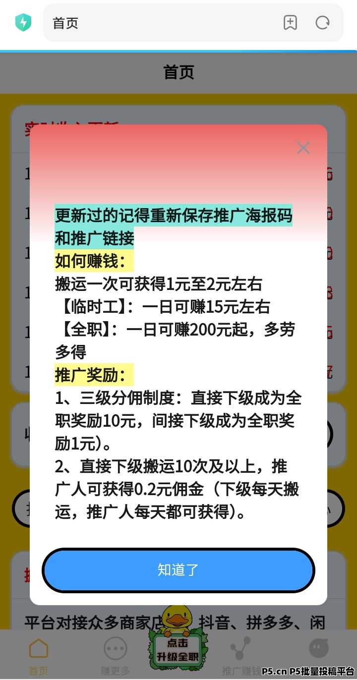 搬运鸭刚出,高质量的搬运挣钱平台 肥肉老母0003246 2026-01-16 09:37:34 692 搬运鸭首码,是一个集合了多种赚钱任务的线上平台,以其操作简单灵活,适合不同人群利用碎片时间参与,轻松实现兼||职创收。搬运鸭如何赚钱:搬运一次可获得1元至2元左右【临时工】:一日可赚15元左右【全职】:一日可赚200元起,多劳多得推广奖励:1、三级分佣制度:直接下级成为全职奖励10元,间接下级成为全职奖励1元)。2、直接下级搬运10次及以上,推广人可获得20元佣金(下级每天搬运,推广人每天都可获得)。