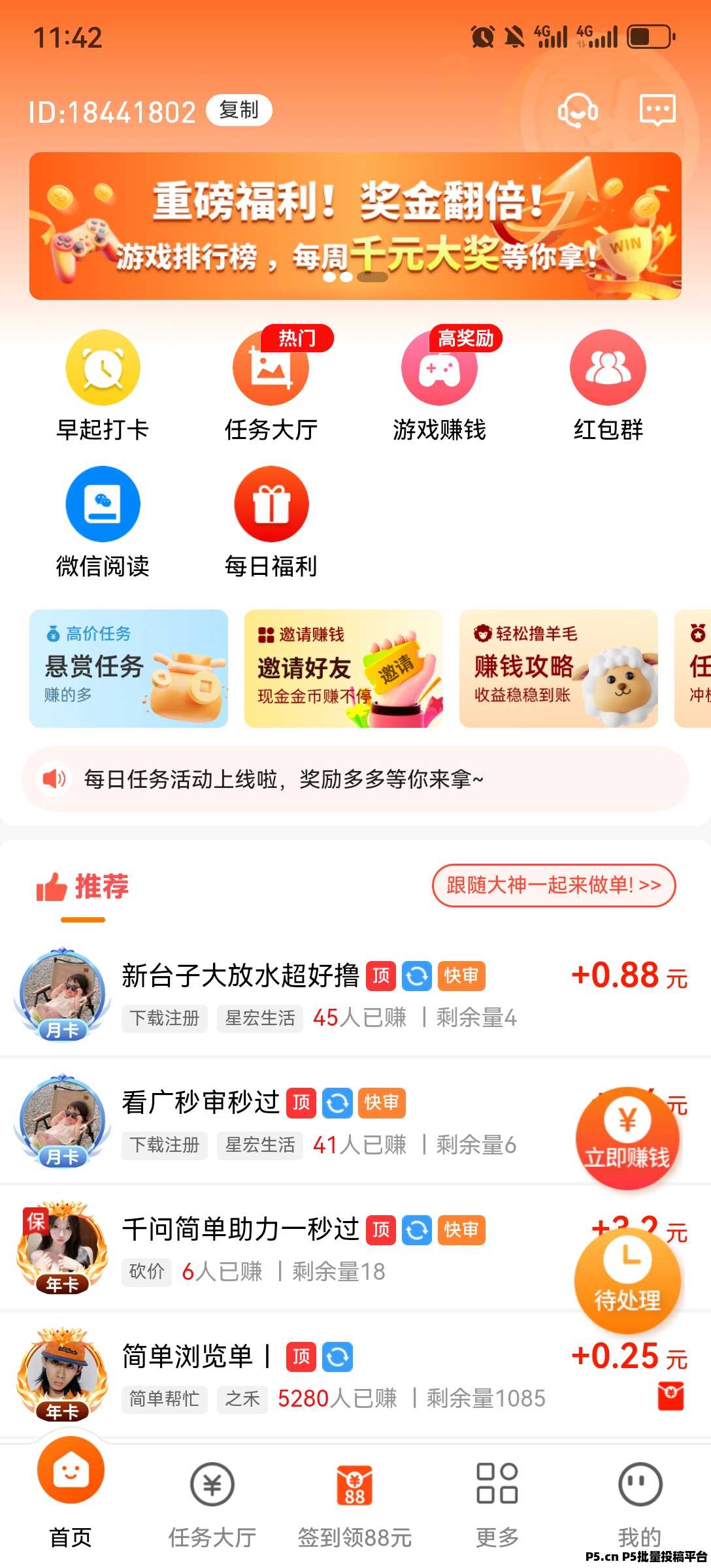里面有签到任务 微信略读 下载任务 玩了很久了 比盘子强多了 不花什么时间
