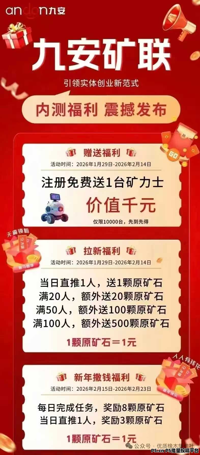 久安平台,绿色长久,过年不放假,可撸可投,每天变米 店流宝000160 2026-02-14 09:57:40 1463 首码九安矿联撸投最后二天送矿机,没玩的赶紧上第一个方案:每天看三个广告领取个矿机,看35天一次性领取500个币第二个方案:花500米购买一个500的矿机,兑换之后每天可以一键领取收益,每天中午12点还有广告约60米重点就是每天都能卖,回本很快没有任何手续费,内转给我都在收干不干一句,剩下的我帮你安排!收货热度非常高,要参与的尽快上车,零撸月收入高达一千零撸的话35天可以得到1000块左右服务V:jindoumangguo