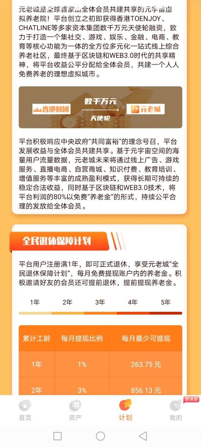 元老城全民预备退休计划现已正式上线,相比现在每个月要交钱,交够十几20年才能退休,还要工作十几20年才能退休,这个项目简直太香了,每天签到就行,啥也不用做,现在每月可以提现养老金的0.1%,正式退休可以提现100%分之1到100%10,升级新版本后,可在【我的养老金】页面,按照比例提取本月养老金,每月1号起,可提现当月养老金,每月可提现一次。这是个互联网3.0模式,响应国家号召共同富裕