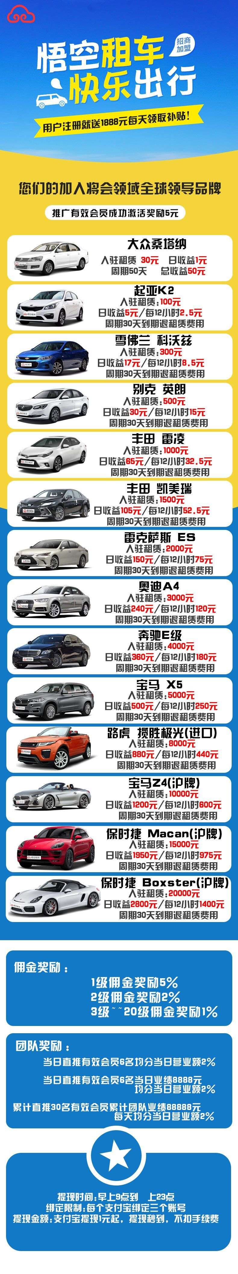 首码《悟空租车》注册送1888元,30元每天挂机赚钱,月入过万的项目,1元秒到账。