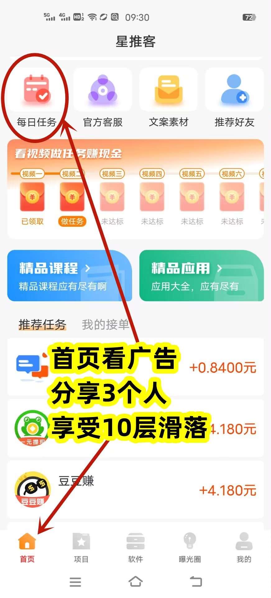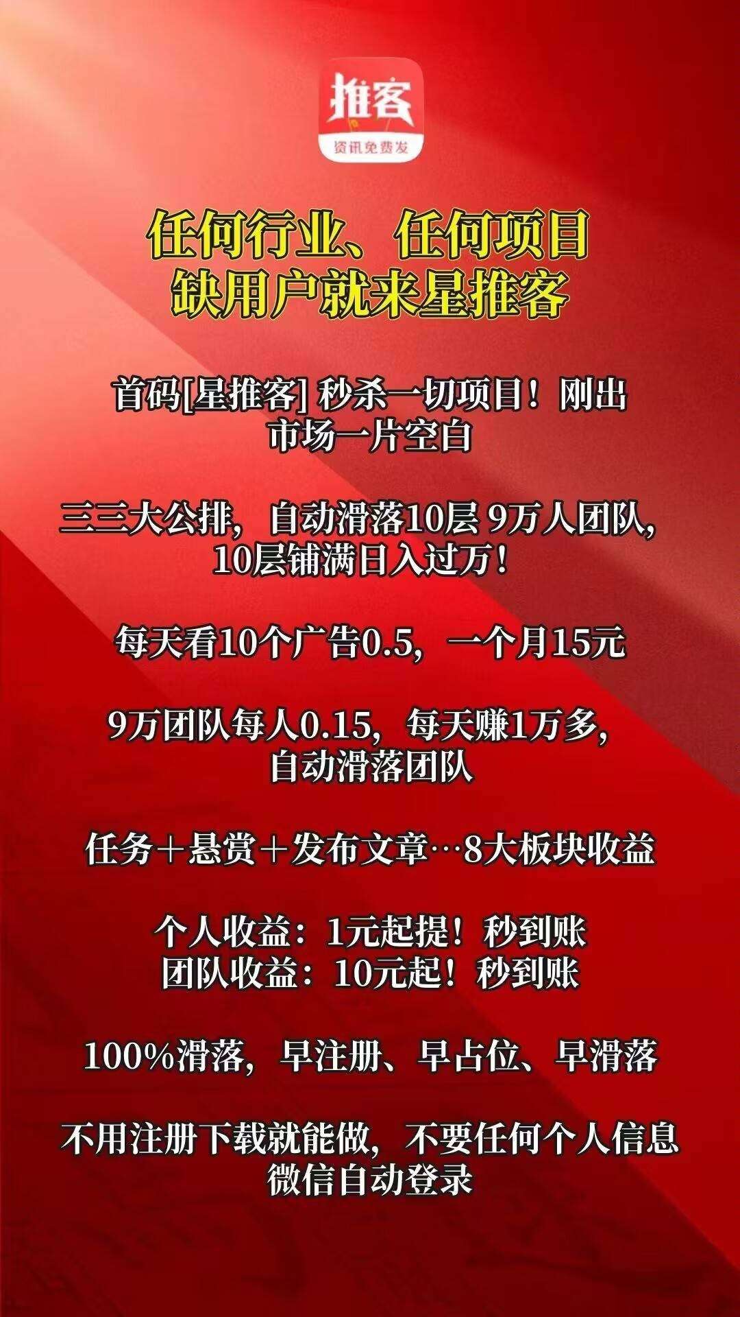 当网友下载注册【星推客】APP后,首先第一件事就是要完成看10条广告任务,这是做星推客事业的基础条件,因为自己不完成每日任务,就得不到自看广告佣金。如果你产生了下级团队,你自己不完成广告任务,那你当天所产生的梯队收入也会归零。如何在星推客会员每天按时完成今日任务这个问题,推客导师前几篇文章都有提及到,今天重复强调一遍,星推客自看广告得0.5元这是重中之重,是做星推客事业的根基,这并不是说0.5本身价值有多大,而是这个0.5我们非得到不可的问题。换言之这是一个执行力的问题,如果说你每天花几分时间完成基本任务都不能坚持,那你何以带团队呢?何以在星推客这个平台创业致富呢?因此,我们可不要小看这个0.5元,它可是我们撬动星推客这份大事业的杠杆!