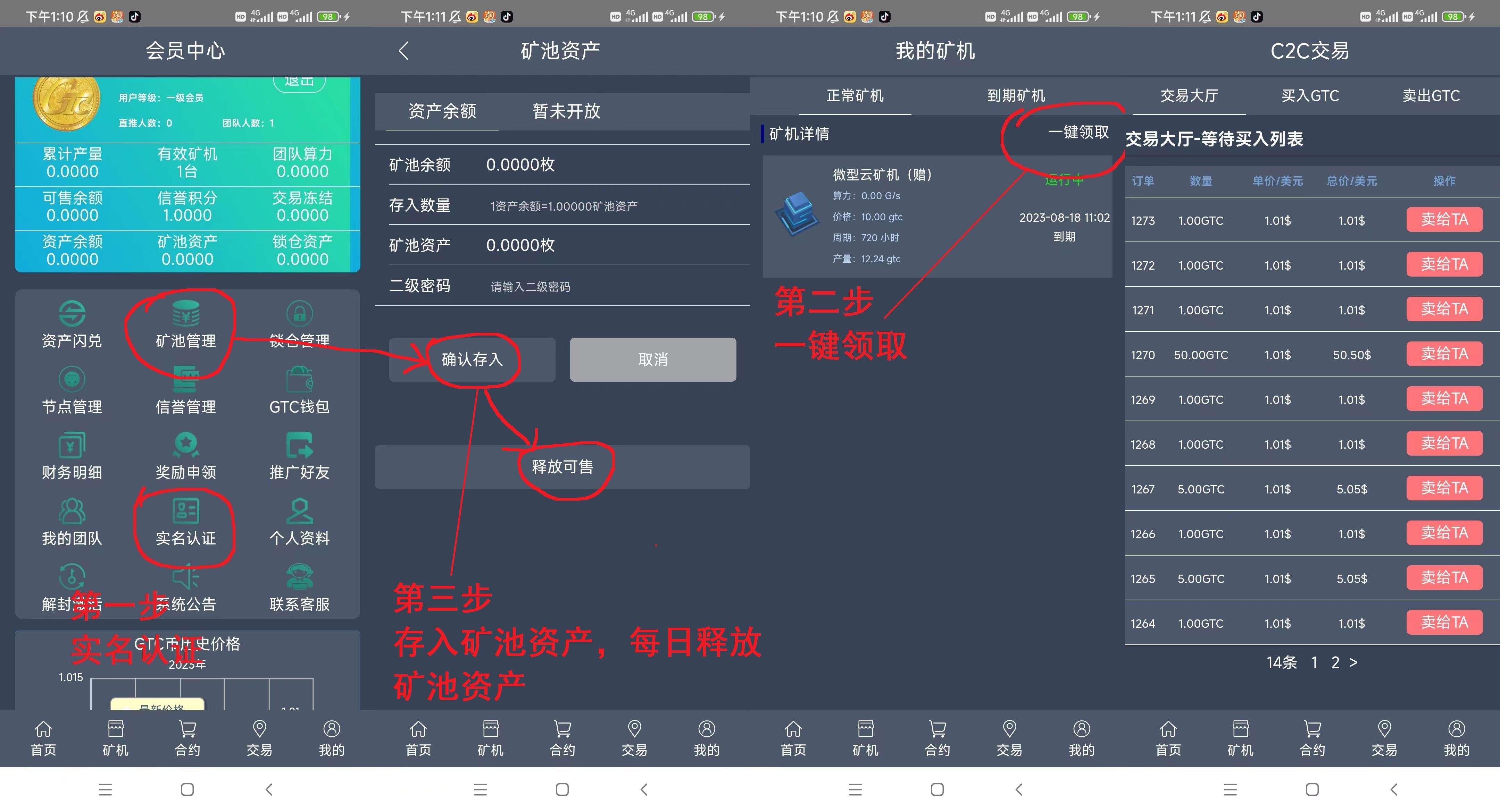 每日操作步骤: 每24小时一键领取矿机收益,存入矿池资产,每日释放矿池资产