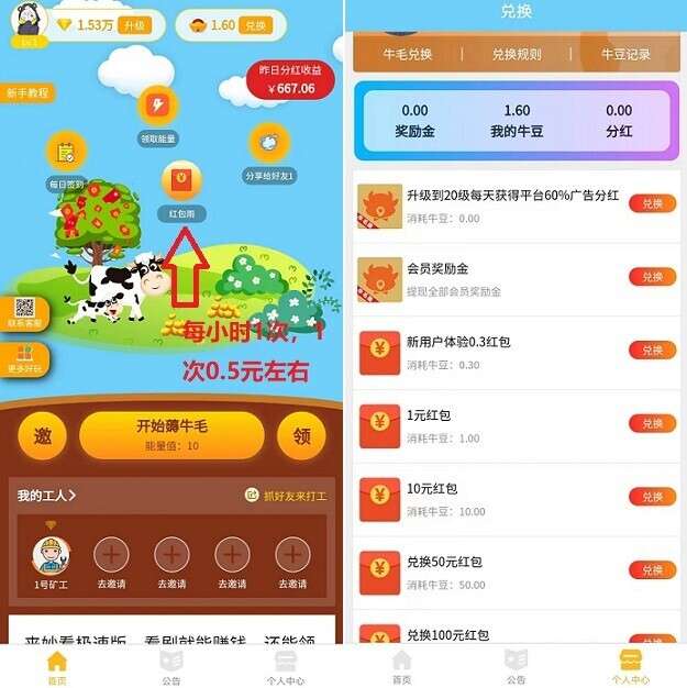 首页每1个小时可领取1个0.5元左右的红包,每天看广告领取能量,用能量薅牛毛,牛毛够了可在右上角升级,升到20级即可瓜分平台60%广告收益的分红,邀请二级分成,直推得50能量+20%牛毛收益,间接好友10%收益。
