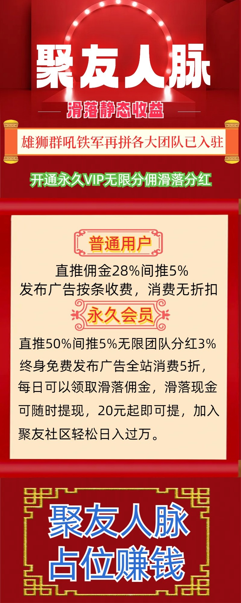 【聚友人脉】最新引流推广平台,火爆上线!全网首创矩阵分红、滑落现金、阅读赚钱无限分佣模式,海量红包领到手软!会员每日领取现金滑落,免费发广告,上头条、置顶、刷新消费5折!海量网赚项目,推广流量大效果好,缺人脉、缺流量、缺项目首选APP!