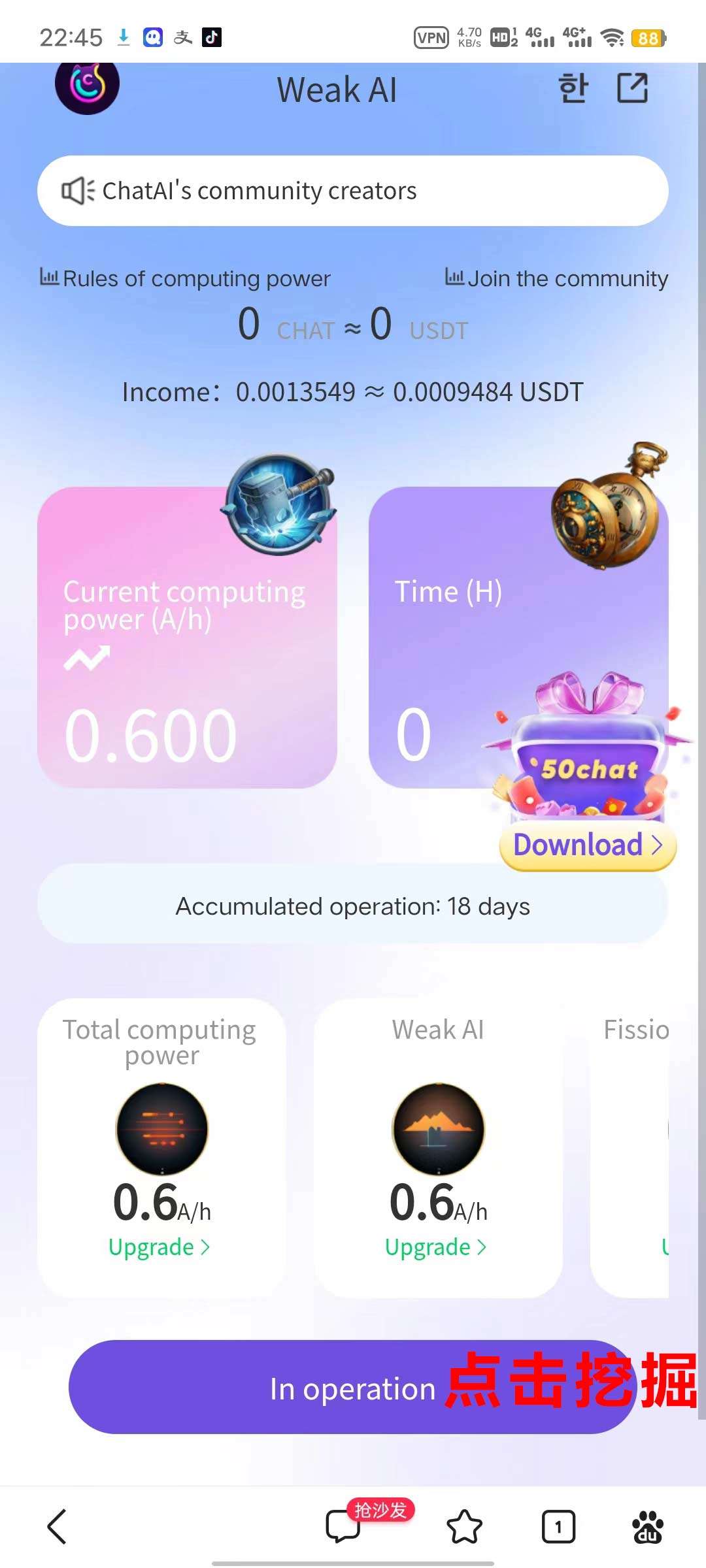 新用户注册即得0.6A/H的算力,月产432个bi。推荐5个好友算力提至1.2A/H,10个好友算力1.8A/H,封顶21人,最高算力2.4A/H!