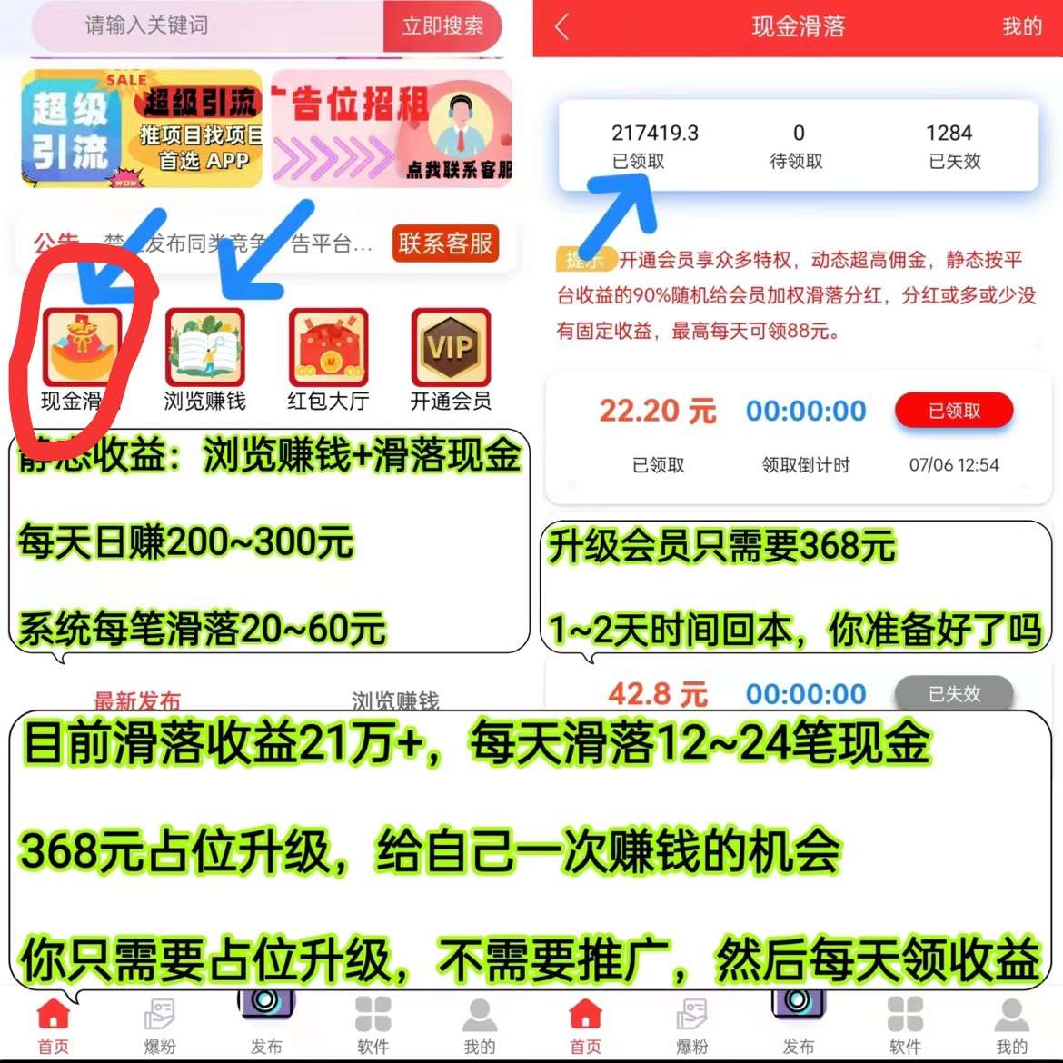 1、静态收益:阅读赚钱+全网公排滑落现金,您只需注册占位升级,您上级团队收益,系统每天自动滑落分给您,日赚200~300元。