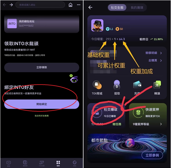 当你注册 INTO 时,你将立即获得100个 TOX 币的空投。通过社交聊天赚取:与好友在平台上发送消息互动,每天都可以获得 TOX 奖励,你的好友互动越多,你获得的奖励也越多。闲置的 TOX,参与全球节点,获取TOX 的分红。通过质押挖K、社交聊天、参与全球节点投票等方式,你可以在 INTO 生态中获取丰厚的收益。
