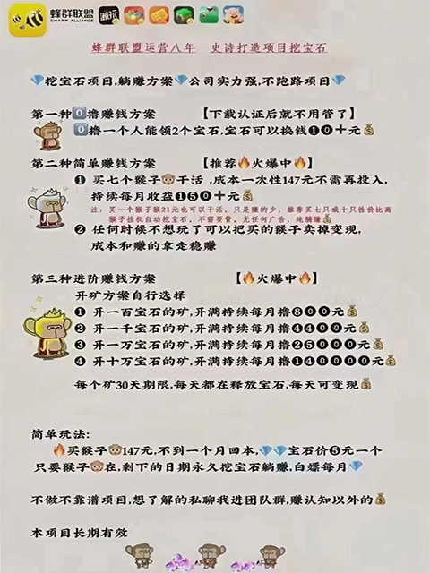 两种方式管道收益:几个月前听我入场的家人,赚麻了!第一种、实名认证,新人注册免费收益一月或本金147,猴卡即将涨价喽,一月回本,购7张无猿猴自动收入宝石,随时变现;几个月前2元多一个宝石,因太火爆,现已疯狂上涨7元多一个宝石,你细品!跟上节奏,赚钱就跟呼吸一样!!第二种、无需本金,扭兔单,靠每天免费开蛋升级战力自动收入宝石,随时变现。注册好后暂时不升级,因升级需要消耗7个猴子!!!
